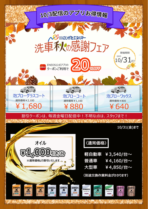 - ガソリン・軽油割引クーポン&洗車割引クーポン配信のお知らせ