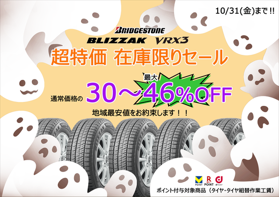 明日9/20(土)~9/30(火)まで! 「夏タイヤ在庫処分セール」 タイヤとタイヤ組替作業工賃総額(税別)に対して、ポイントが10倍です!!! (Vポイント、Rポイント、dポイント) この機会にタイヤ購入を検討してみてください♪